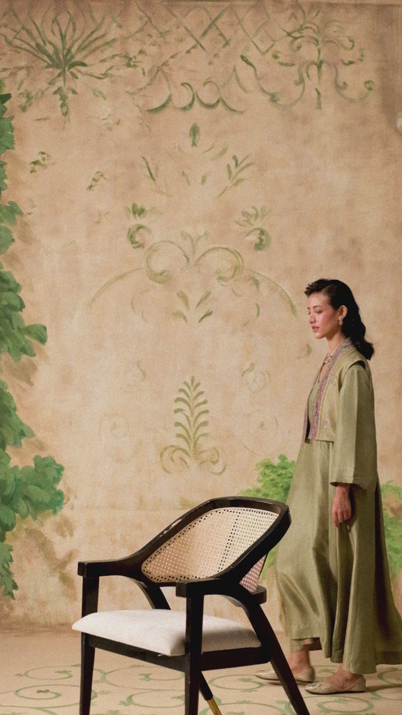 A flowing green tunic crafted in a Silk fabric, featuring a gently flared silhouette. The neckline and sleeve edges are subtly accentuated with delicate bead highlights, adding a touch of understated elegance. The sleeves are designed in a relaxed, slightly bell shape, offering volume and a soft, fluid drape that enhances the garment's graceful appeal.
