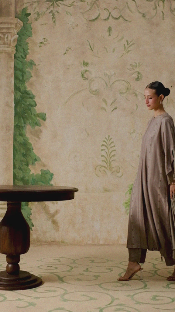 A relaxed-fit silk kurta featuring front and back pleats, adorned with delicate beadwork and thread embroidery lines. The uniquely detailed sleeves and classic bandhani print enhance its graceful drape, showcasing refined craftsmanship for a sophisticated and elegant look.