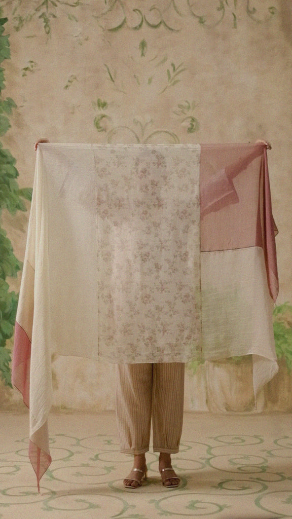 Dupatta - An off-white and pink paneled silk dupatta, joined with fine lace detailing. Soft and flowing, it adds a gentle contrast and completes the set with understated elegance.